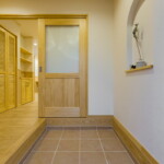 R型のニッチがおしゃれな玄関。ホール側に玄関収納もしっかり確保。玄関を上がってLDKに至る動線上に、帰宅時の荷物や上着をしまえる収納スペースを設けています。