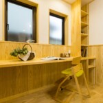 ダイニングに設けたスタディコーナー。教科書や参考書などをしまっておけるように、サイドに棚も用意した。正面に窓があり、開放的な雰囲気の中で気持ちよく勉強できます。