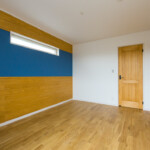 白い壁とクリの無垢材の床が広がるベーシックな空間に天井のレッドシダー張りが映えるLDK。