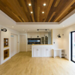 ご主人がこだわったのは、リビングの折上天井のレッドシダー張り。ニッチの壁も同材にして統一感を強調。キッチンには黒板風のクロスを用い、クールなアメリカンスタイルの空間を演出しました。