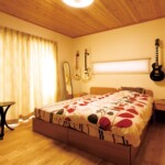 主寝室には、ご主人自慢のギターが何本も飾られている。
