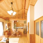 四方を自然素材で囲まれた勾配天井のLDKは、開放的で健康的。暮らしの中心にふさわしい空間です。
